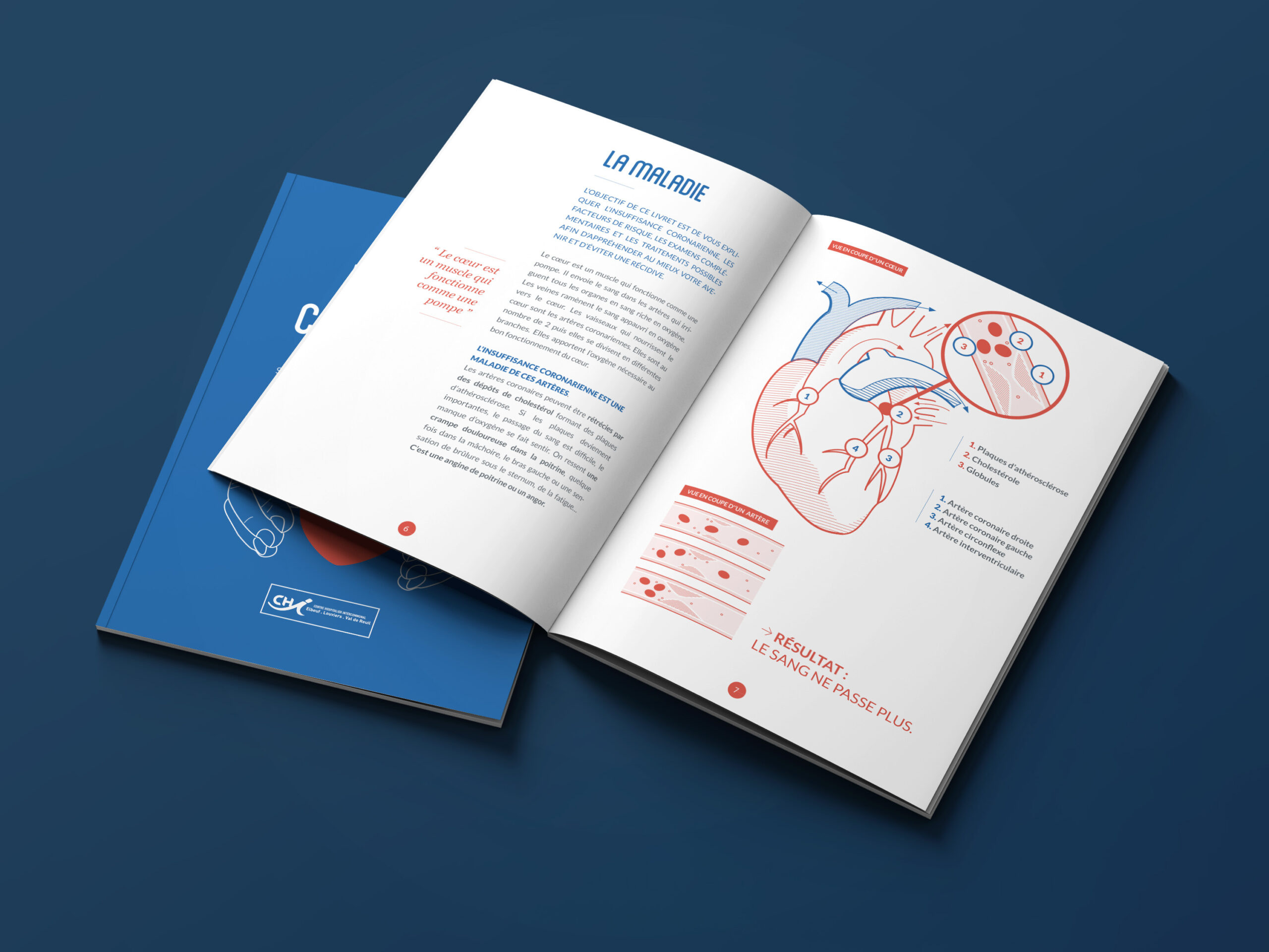 Nous avons également réalisé un livret explicatif à destination des patients atteints de maladies coronariennes. Ce document associe clarté éditoriale et illustrations médicales pour faciliter la compréhension des pathologies et des parcours de soins.